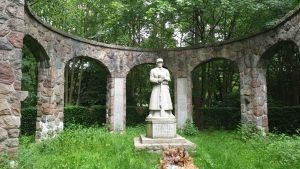 Von Hecke und Bäumen eingefasste Erhöhung am Ende einer großen Wiese. Vorne sieben Stufen. Oben ein aus Natursteinen gemauerter Halbbogen auf sechs Pfeilern.