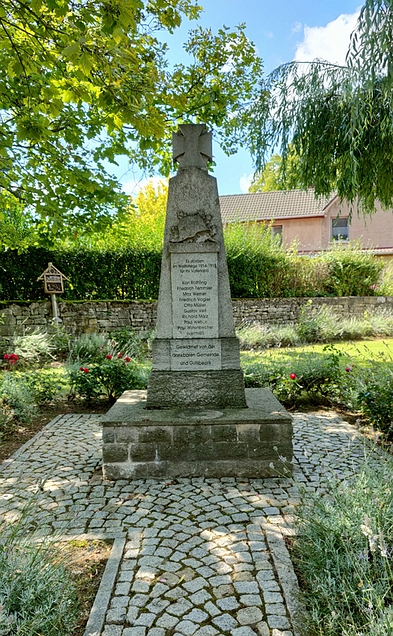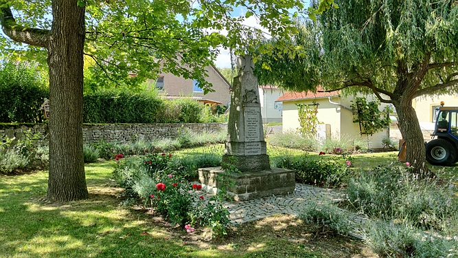 Denkmal mit krönendem Tatzenkreuz in einer kleinen Grünanlage.