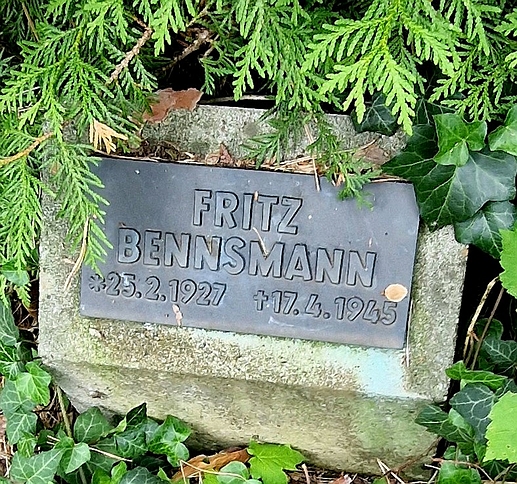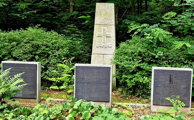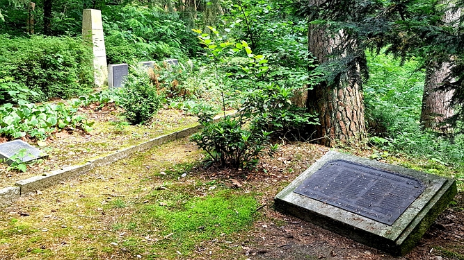 Kriegsgräber von Soldaten des 2. Weltkriegs, die hier bestattet wurden. Die bekannten Namen sind auf drei Tafeln verzeichnet.