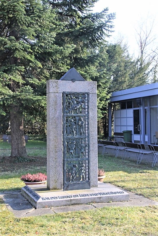 Denkmal bei der Aussegnungshalle: Betontor und dazwischen durchbrochene Szenen aus Metall