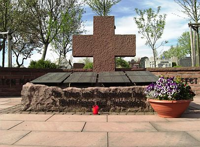 Großes Sandsteinkreuz, davor ein aus Natursteinquatern erichteter Sockel, auf dem acht Gedenkplatten angebracht sind.
