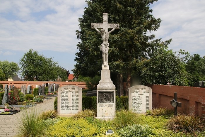 Im Friedhof: Denkmal, in der Mitte Kreuz, am Sockel seitlich je eine Tafel und zwei stehende Steintafeln, daneben ein Kriegsgrab.