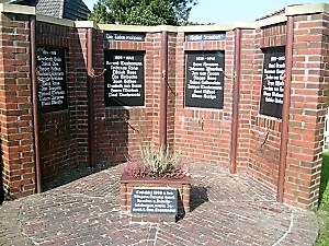 Auf dem Friedhof bei der Kirche steht im Halbkreis eine rote Backsteinwand, darin eingelassen sind schwarze Tafeln mit Namen in weißer Schrift (beide Weltkriege).