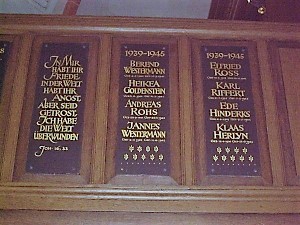 In der Kirche an der Holzempore in würdevoller goldener Schrift geschrieben befinden sich Namen und Daten (Zweiter Weltkrieg), sowie Bibelzitate.
