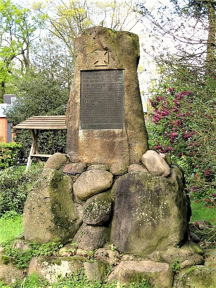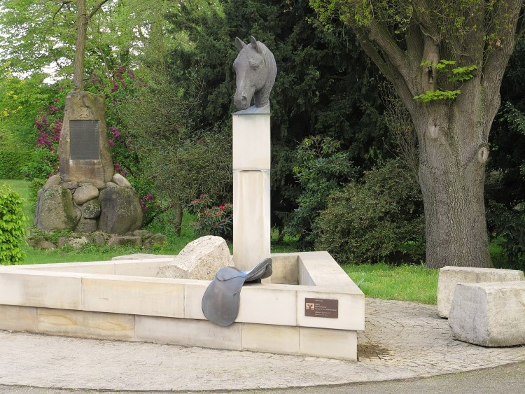 In den obersten, großen Findling mit einem Eisernen Kreuz ist eine Metallplatte mit Inschrift und den Namen der gefallenen Gestütsangehörigen der beiden Weltkriege eingelassen.
