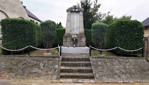 Schmales portalförmiges Denkmal zentral an der Dorfstraße gegenüber der Kirche. Bekrönt mit einem EK-Symbol. In der Mitte die lange Tafel mit den Namen. Etwas erhöhte Lage mit Treppenstufen. Eingefriedet von Lebensbäumen.
