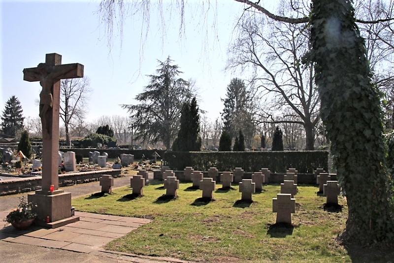 Kriegsgräber im Friedhof, am Rand ein Hochkreuz, sowie Daten von privaten Gedenksteinen.