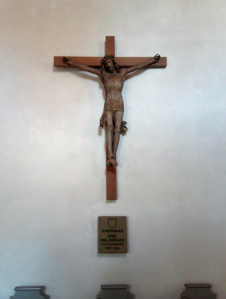 Kreuz und Gedenktafel an einer Längswand in der Kirche.