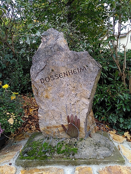 Der Stein soll die Gemeinde Dossenheim symbolisieren. Aus einer einbetonierten Stacheldrahtrolle (das Lager Gurs) ragt eine Hand hervor, die Spuren an dem Stein hinterlassen haben.