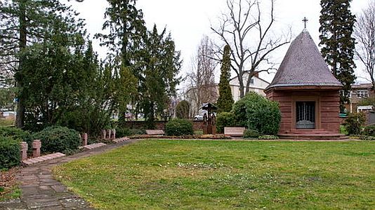 Zwei große liegende Steinplatten rechts und links neben der Friedhofskapelle.