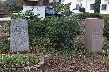 An der Mauer des alten Friedhofs stehen zwei Gedenksteine mit Inschriften.