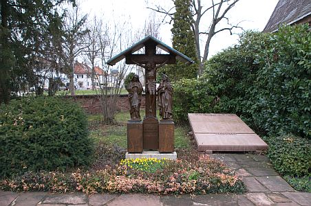 Kriegsgräber: drei Sandsteinkreuze und 21 Einzelgedenksteine.