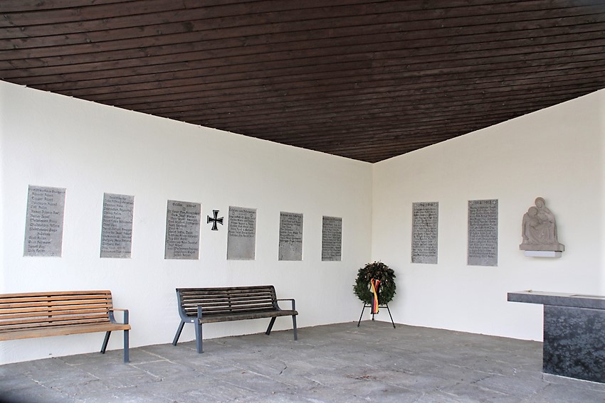 Acht Gedenktafeln in der Aussegnungshalle, daneben eine Pieta.