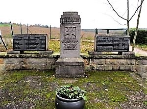 Steinsäule mit Deutschem Kreuz und Inschrift. Dahinter auf einer Mauer zwei Gedenksteine.