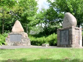 In einer gepflegten Anlage Ehrenmal für die Kriegstoten beider Weltkriege. Gedenktafeln mit den 54 bzw. 85 Namen der Kriegstoten beider Weltkriege,