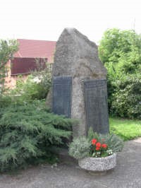 Vor der Kirche ein aufrechter Naturstein mit zwei Gusstafeln zum Gedenken der 22 und 45 Kriegstoten beider Weltkriege.