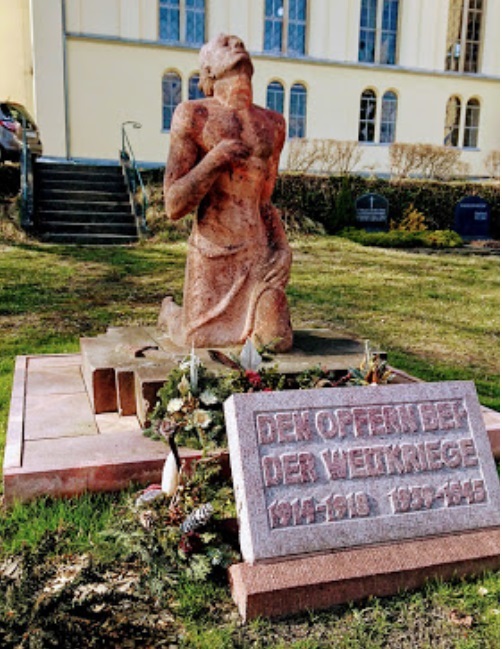Das Denkmal ohne Namen steht auf dem Friedhof. Es zeigt eine kniende zum Himmel schauende Steinfigur.
