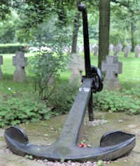 In der Nähe der Betonkreuze für die Gefallenen des Ersten Weltkrieges liegt ein großer Schiffsanker. Eine kleine Metallplatte am Boden trägt eine Widmung.