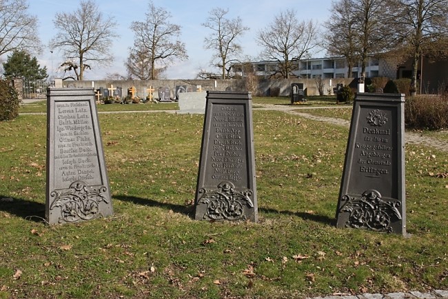Drei Metalltafeln im Friedhof.