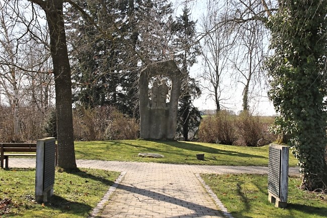 Im Friedhof Denkmal mit Mann und Frau in der Mitte. Vor dem Denkmal links und rechts je drei Gedenktafen,