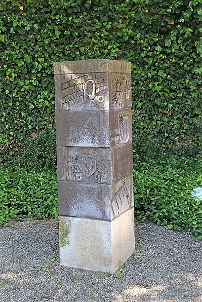 Im Rosengarten in der Nähe des Schlosses eine Steinsäule mit Ornamenten.