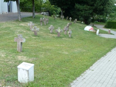 Rasenstück namenlose Steinkreuze gesetzt.