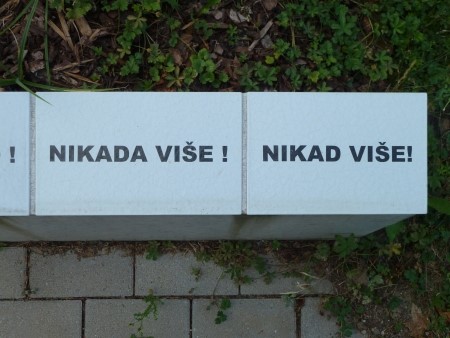 Auf einer kleinen weißen Betonmauer befinden sich als Abschluss weitere Inschriften, und zwar die