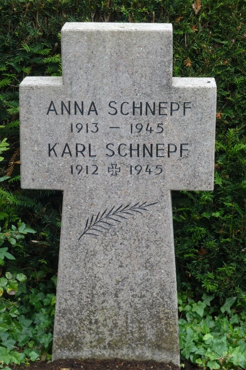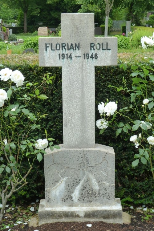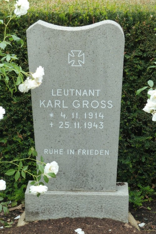 Im Friedhof: Kleine durch eine Hecke abgegrenzte Anlage mit Gräbern von Militär- und Ziviltoten des Zweiten Weltkriegs.