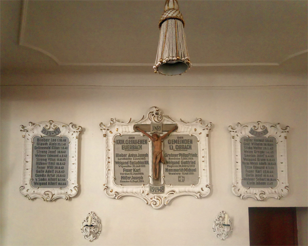In der katholischen Kirche St. Michael befinden sich rechts vom Haupteingang unter der Empore drei reichverzierte Gedenktafeln mit den Namen und Sterbedaten der katholischen Gefallenen beider Weltkriege der Ortschaften Euerbach und Obbach. Die Tafel für die Gefallenen des 1. Weltkrieges ist mittig durch ein Kreuz mit Korpus geteilt.