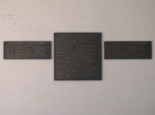 Drei Metalltafeln an einer Wand in der Aussegnungshalle im Friedhof Euerbach mit den Namen und Lebensdaten (Geburts- und Sterbejahr) der Gefallenen und Vermissten beider Weltkriege.
