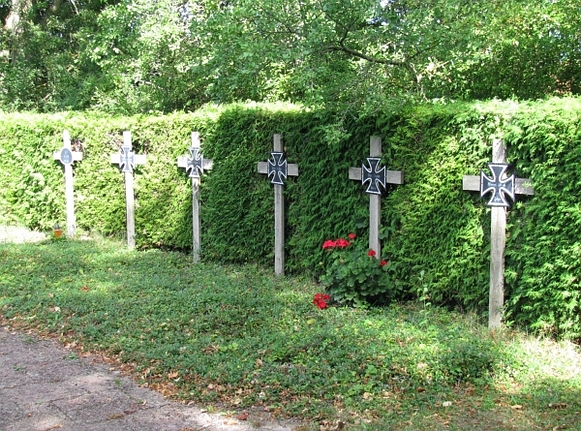 Im Eingangsbereich des Friedhofs stehen in einem Grünstreifen fünf Grabkreuze für Gefallene der Kämpfe um Euerbach.