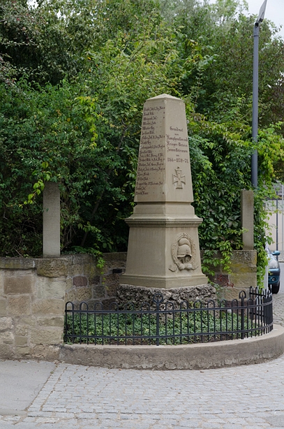 Obelisk auf Postament mit Gedenkinschrift und einem Eisernen Kreuz auf der Vorderseite. Auf den Seitenflächen die Teilnehmer der Feldzüge 1866/70-71. Das Postament ziert ein bayrischer Infanteriehelm in einem Lorbeerkranz.