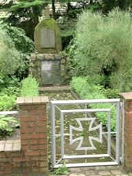 In einer kleinen Anlage auf einem Natursteinsockel ein Findling, darauf ein Eisernes Kreuz, aufgesetzte Tafel mit Inschrift.