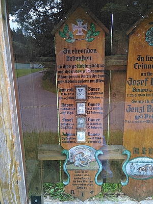 An der Brettspitze ist ein Eisernes Kreuz mit Lorbeerzweig aufgemalt. Unterhalb der Inschrift, die auch vier Portraitfotos zeigt, ist auf Holz ein farbiges Bild mit Inschrift angebracht. Es zeigt einen verletzten Soldaten, der von einem Heiligen (Christus) aufgenommen wird. Am Fußende des Gedenkbrettes ist eine weitere Inschrift zu sehen.