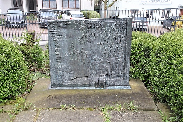 Bei der Kirche stehende Metalltafel mit Reliefs (ohne Namen).