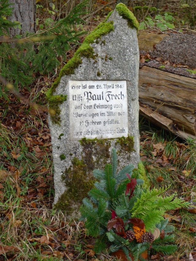 Hier ist am 26. April 1945 Uffz. Paul Frech auf dem Heimweg nach Wurmlingen im Alter von 19 Jahren gefallen.