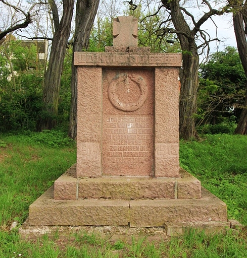 Freistehender Gedenkstein auf 3-stufigem Podest. Oben mit Eisernem Kreuz aus Stein.