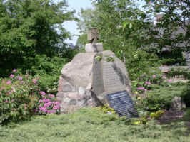 In einer gepflegten kleinen Anlage ein großer Findling als Ehrenmal für die Kriegstoten des Ersten Weltkrieges, die 10 Namen erscheinen auf dem Stein wie in einem aufgeschlagenen Buch. Auf der Spitze ein Eisernes Kreuz. Vor dem Stein eine schwarze Tafel mit den Namen der 27 Kriegstoten des Zweiten Weltkrieges.