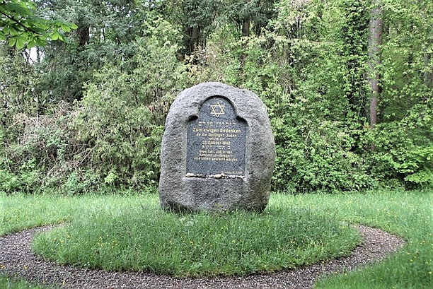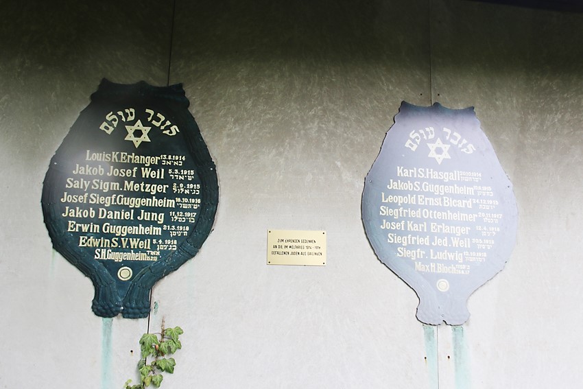 Im jüdischen Friedhof zwei Gedenktafeln an einem kleinen Gebäude (Erster Weltkrieg) und ein Gedenkstein (Zweiter Weltkrieg)