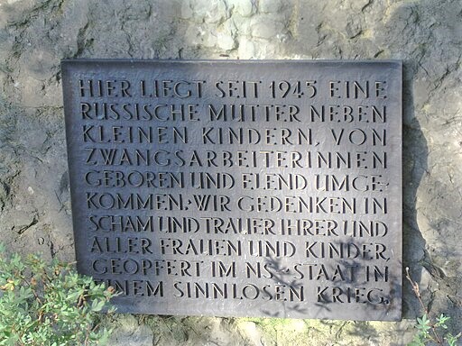Bronzetafel am Mahnmal der Gedenkstätte Gantenwald für 19 Säuglinge und die russische Mutter Eugenia Rossamacha (19 Jahre alt),