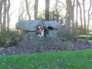 Das Denkmal besteht aus einem großen Findling, der auf zwei etwas kleineren Steinen liegt. Auf dem Gelände dahinter auf Steinen die Namen der Gefallenen.