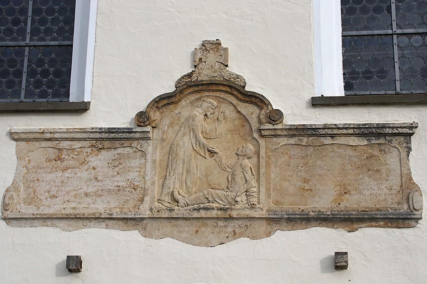 Gedenktafel an der Kirche (nicht mehr alles lesbar).