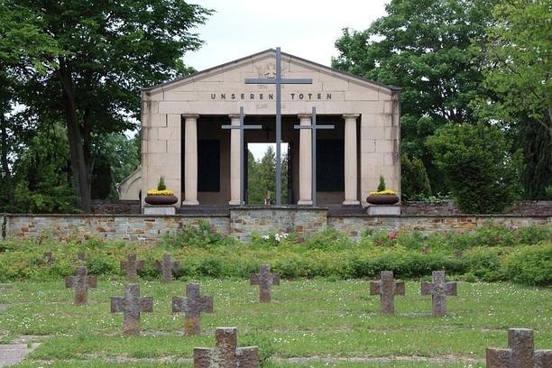 Ehrenhalle in der Form eines Tempels auf dem Alten Friedhof. In der offenen Halle sind vier Gedenktafeln angebracht.