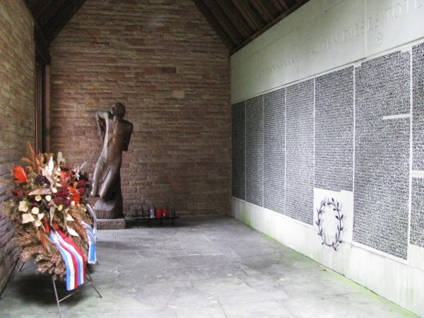 An der Wand gegenüber wurde eine Gedenktafel für einen gefallenen jüdischen Soldaten angebracht, dessen Name auf den Gedenktafeln fehlt.