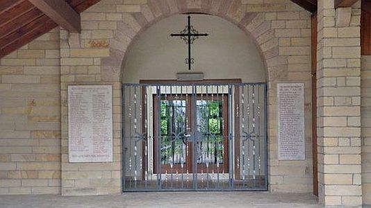 Links und rechts des Einganges zur Aussegnungshalle sind zwei Gedenktafeln angebracht.