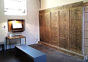 In der Ev.-Luth. Marktkirche St. Cosmas und Damian: Gedenktafel gegenüber einem Seitenaltar für die Gefallenen des Ersten Weltkriegs.