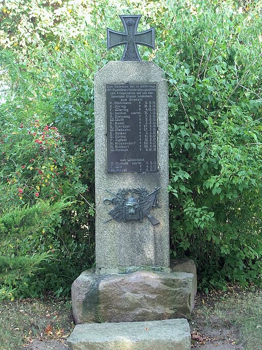Kriegerdenkmal 1914/18 in Granzin: Säule mit krönendem Eisernen Kreuz und Namenstafel.