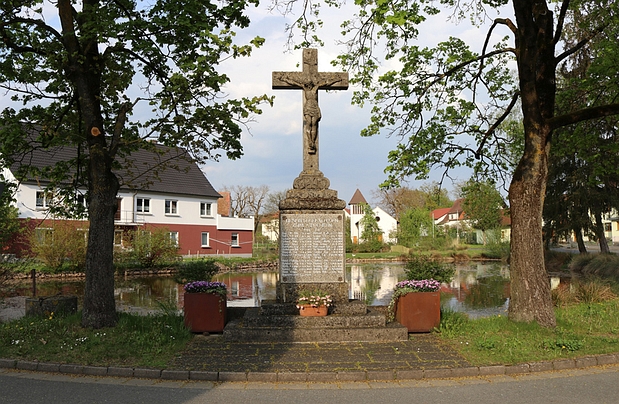 Steinkreuz mit Korpus auf einem Sockel; am Fuß des Kreuzes das Relief eines Eisernen Kreuzes. An der Vorderseite des Sockels ist eine Steintafel mit den Namen und Sterbedaten der Gefallenen und Vermissten beider Weltkriege angebracht.