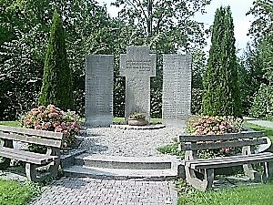 Zwei große Gedenksteine mit Namen stehen mittig in dem Kreis, dazwischen ein Steinkreuz.