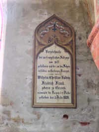 In der Kirche (Baujahr 1906, auf den Mauern einer zerstörten Vorgängerin errichtet): Verzierte Holztafel für 1870/71.